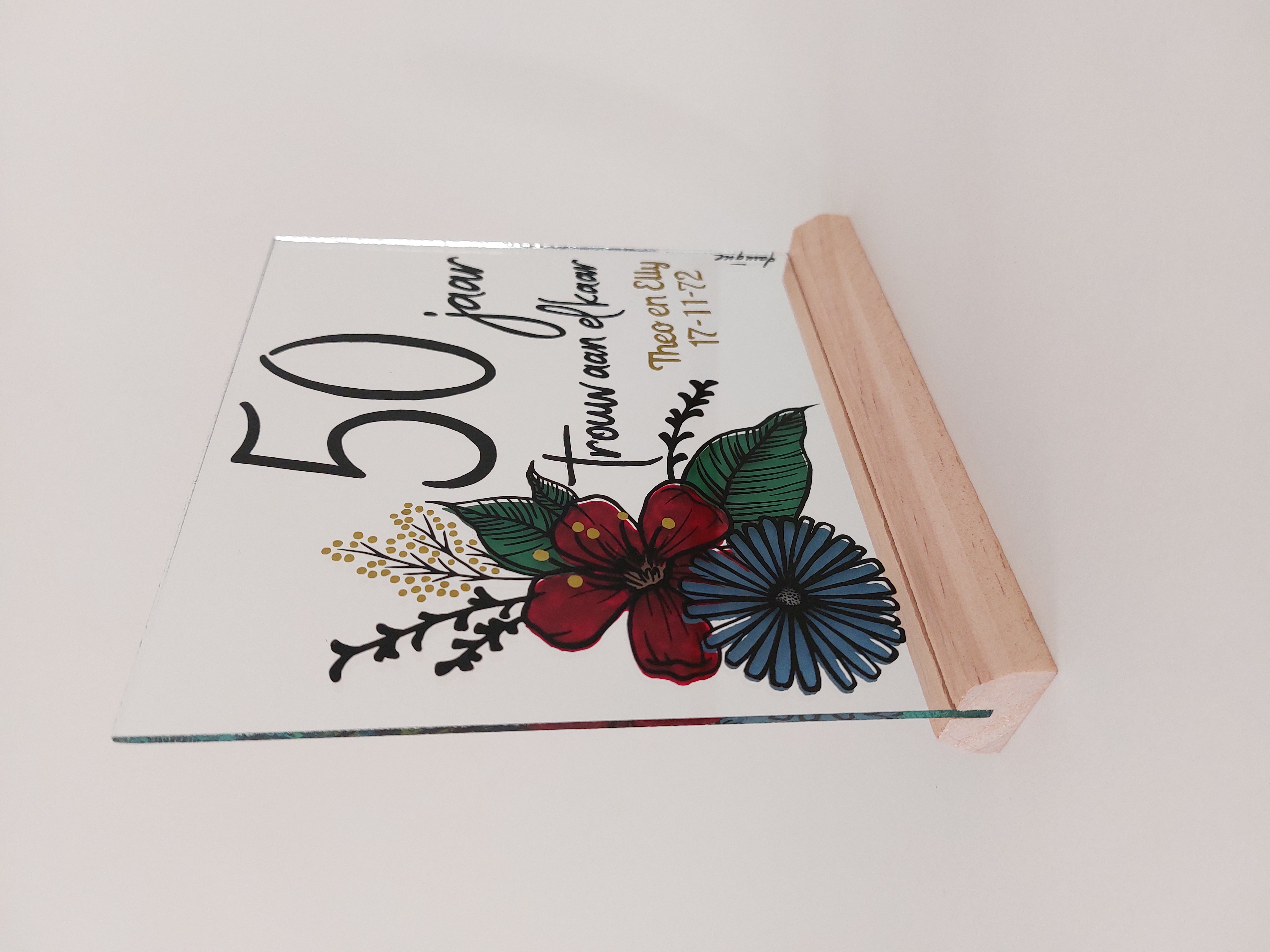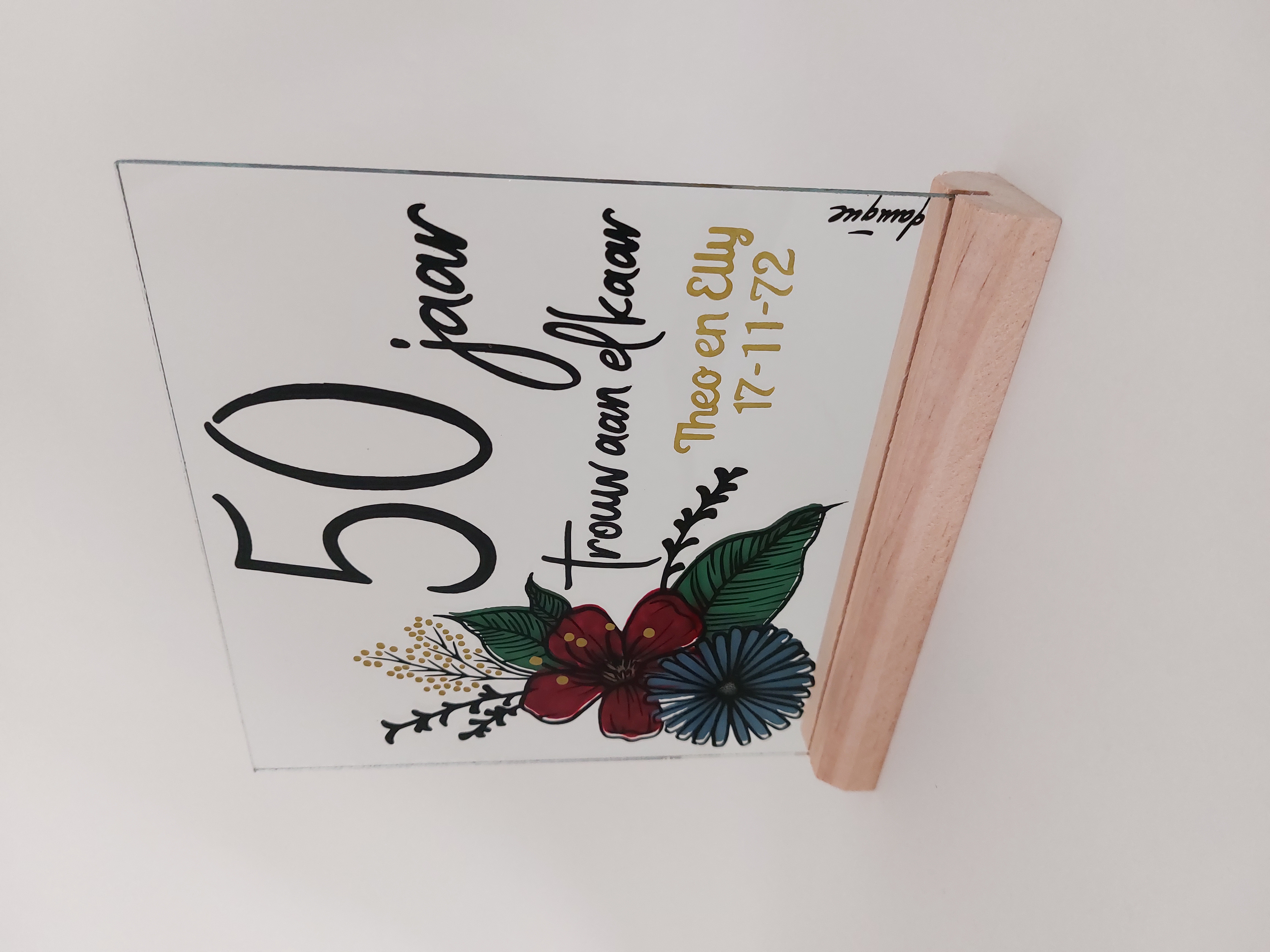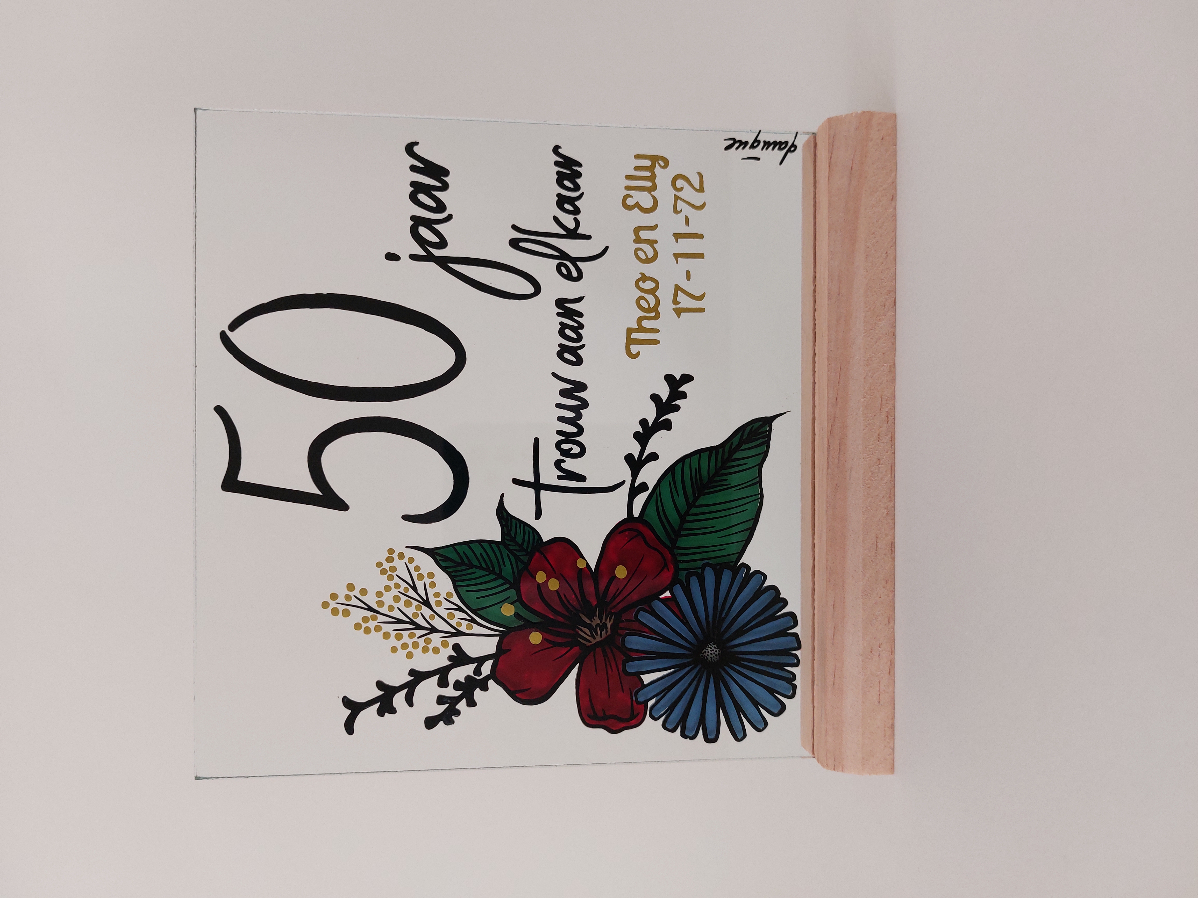Hoe gaat dat in zijn werk? Stuur mij een berichtje via het bestelformulier met de gelegenheid, het onderwerp en de naam of datum, zodat ik een unieke schildering voor je kan ontwerpen.*